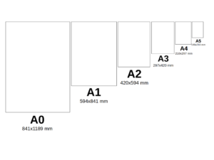 FORMAT – najbardziej znany i powszechnie stosowany papier ksero to A4 o wymiarach 210×297 mm. Zdarza się jednak potrzeba wykorzystania wielkości mniejszej (A5) lub większej (A3). Skalę różnych formatów przedstawia grafika poniżej:
