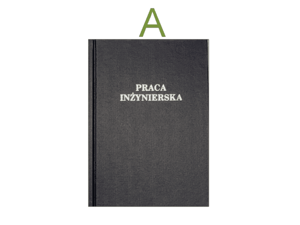Twarda oprawa systemu C-BIND składająca się z okładki przedniej oraz tylnej wykonanej z kartonu powlekanego okleiną o fakturze tkaniny wykonanej z lnu. Przednia okładka posiada wyzłocenie “Praca Inżynierska”.